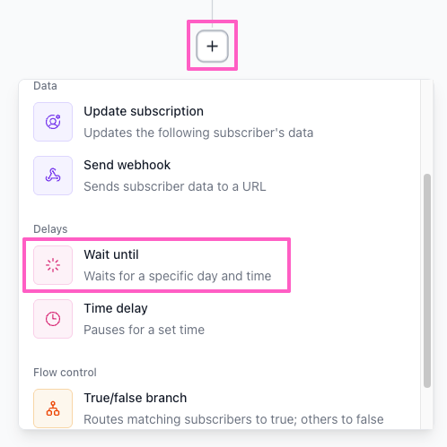 Unlike the Time delay action, which waits a set amount of time after a subscriber enters an automation, Wait until ensures the next step runs at an exact scheduled time. For example, you could hold subscribers until Wednesday at 5:00 AM CT, so everyone receives the next message at the same time.