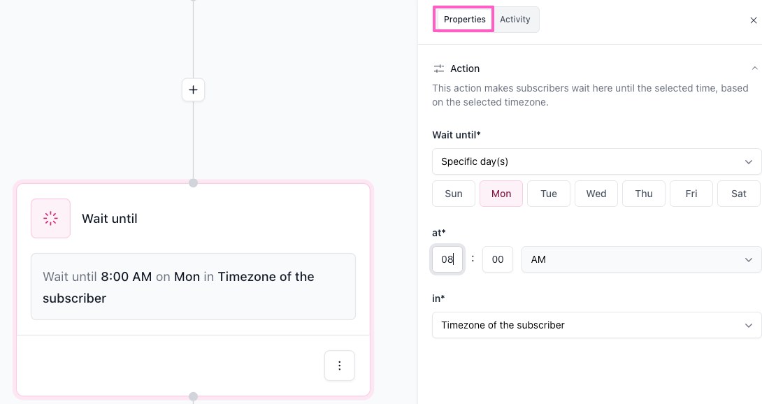 The Wait until action works best when timing matters. It’s especially useful for aligning automation emails with business hours, sending messages on a specific weekday, or ensuring subscribers receive content at consistent, high-engagement times. If your goal is simply to delay a step by a fixed amount of time, such as waiting one day after signup, using the Time delay action may be a better fit.